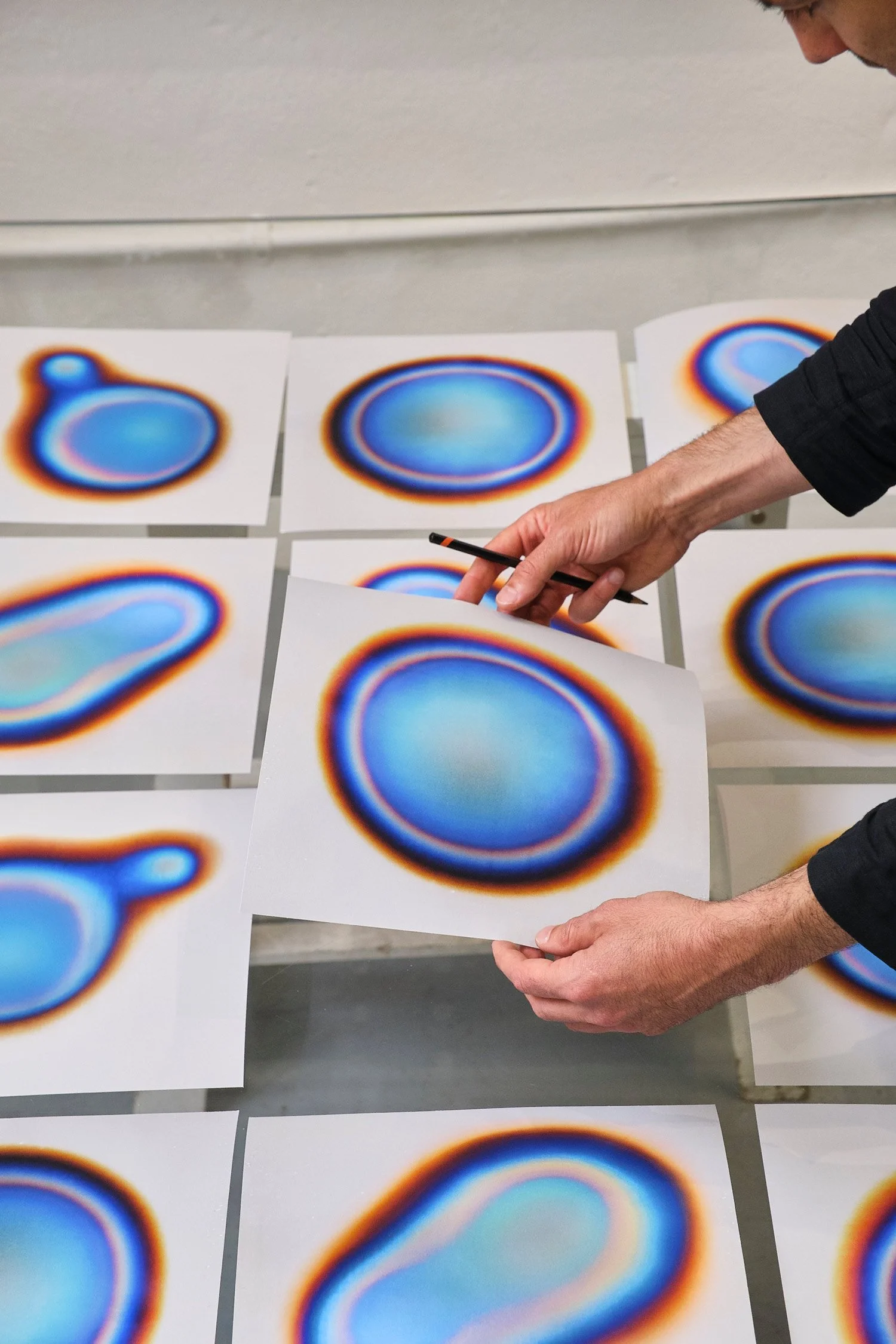 The Fire Prints is a series where metal sheets are exposed to the focused heat of a blowtorch. As they warm, these sheets reveal a dynamic palette of colours.