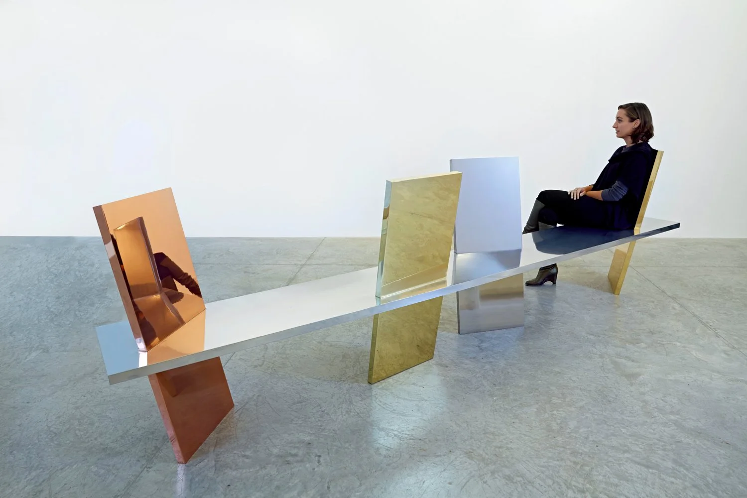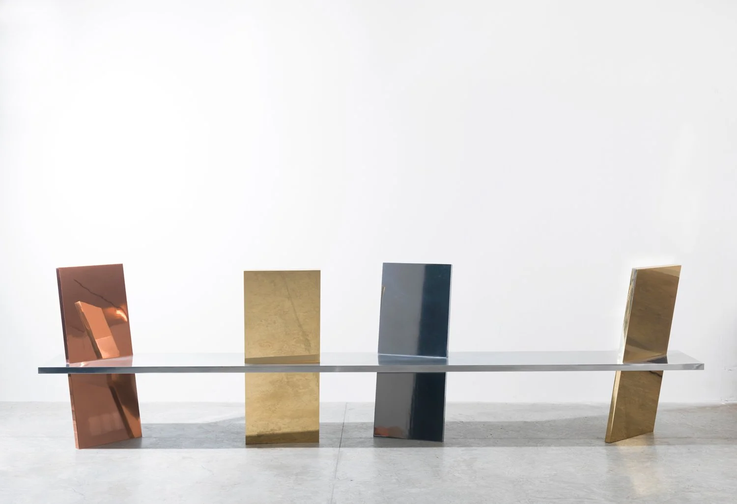 The legs were excavated and inserted into apertures in an aluminium slab where they were allowed to unfreeze and expand at ambient temperature, firmly locking them in place with strong, invisible joins.