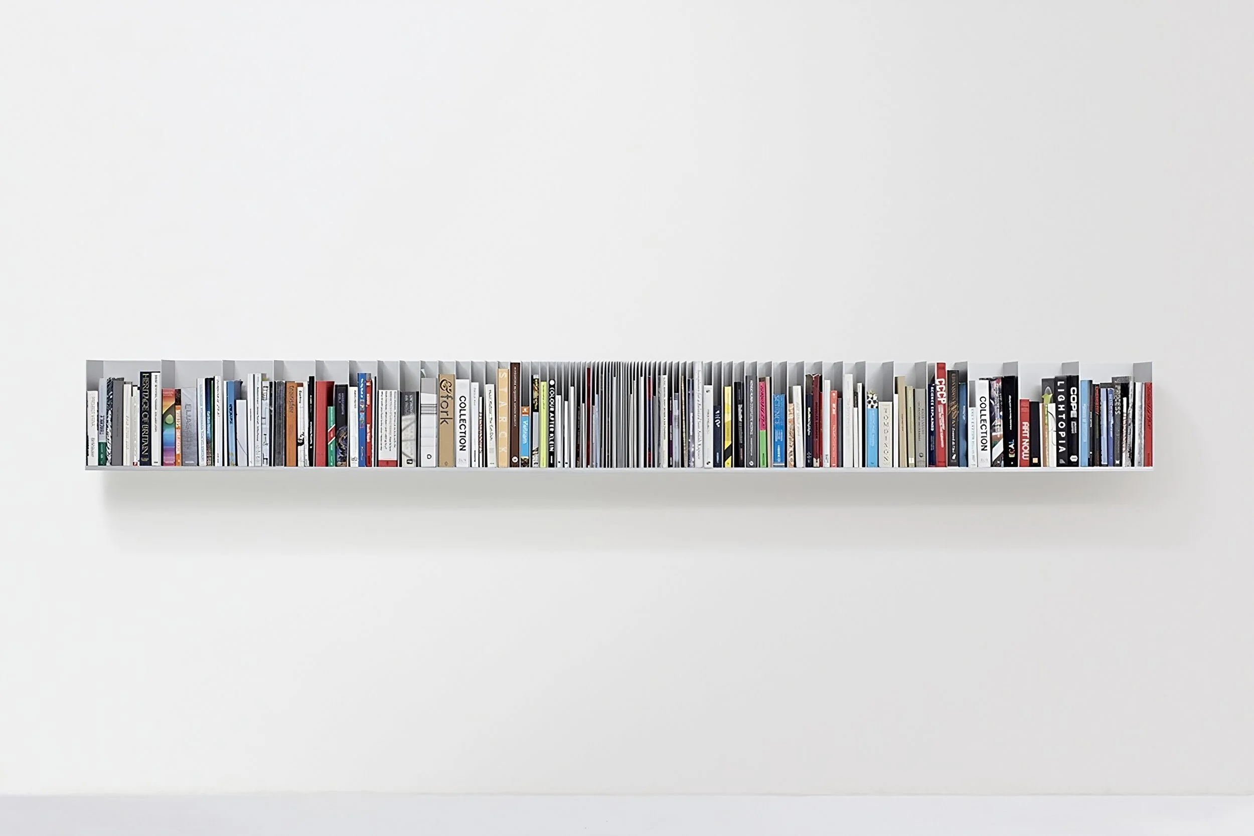 Read More +Extrapolating on the theme, he created a 3.6-meter bookshelf with 68 dividers to hold everything from the largest volumes to a poem on a single piece of paper.