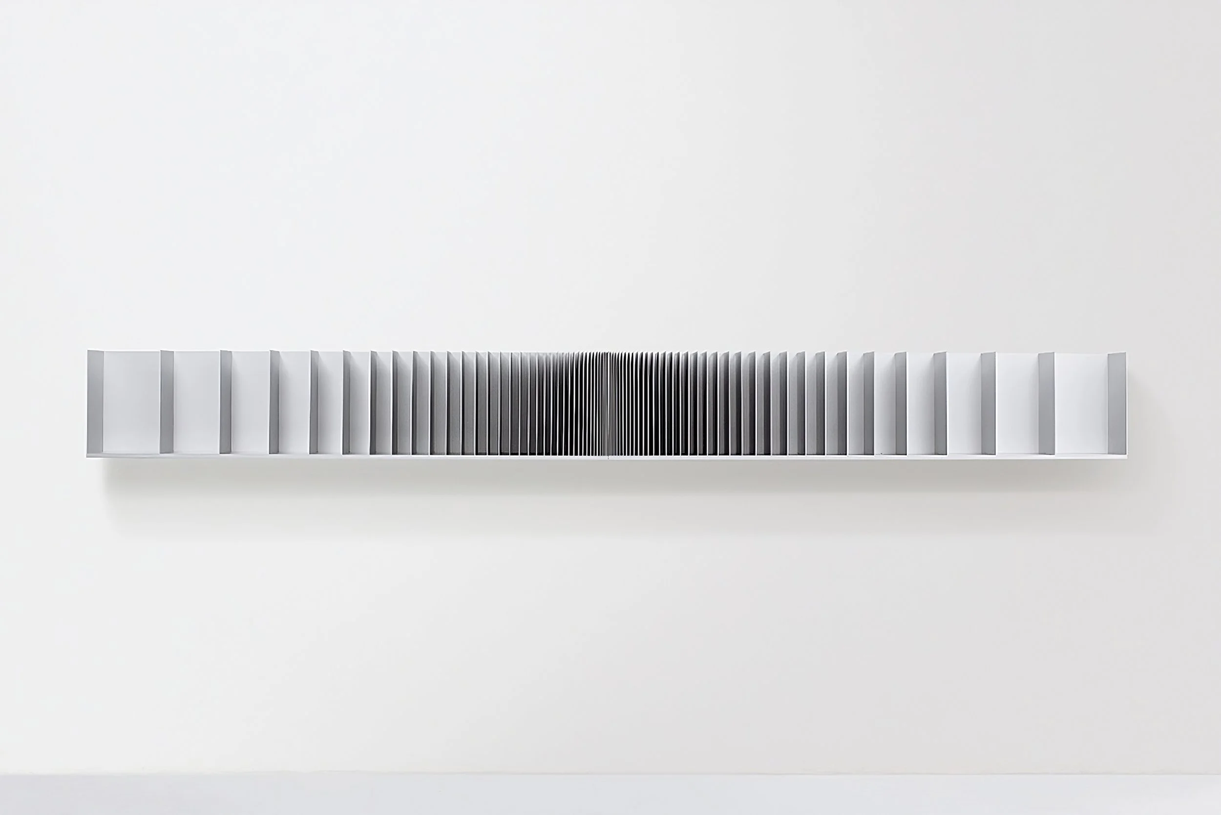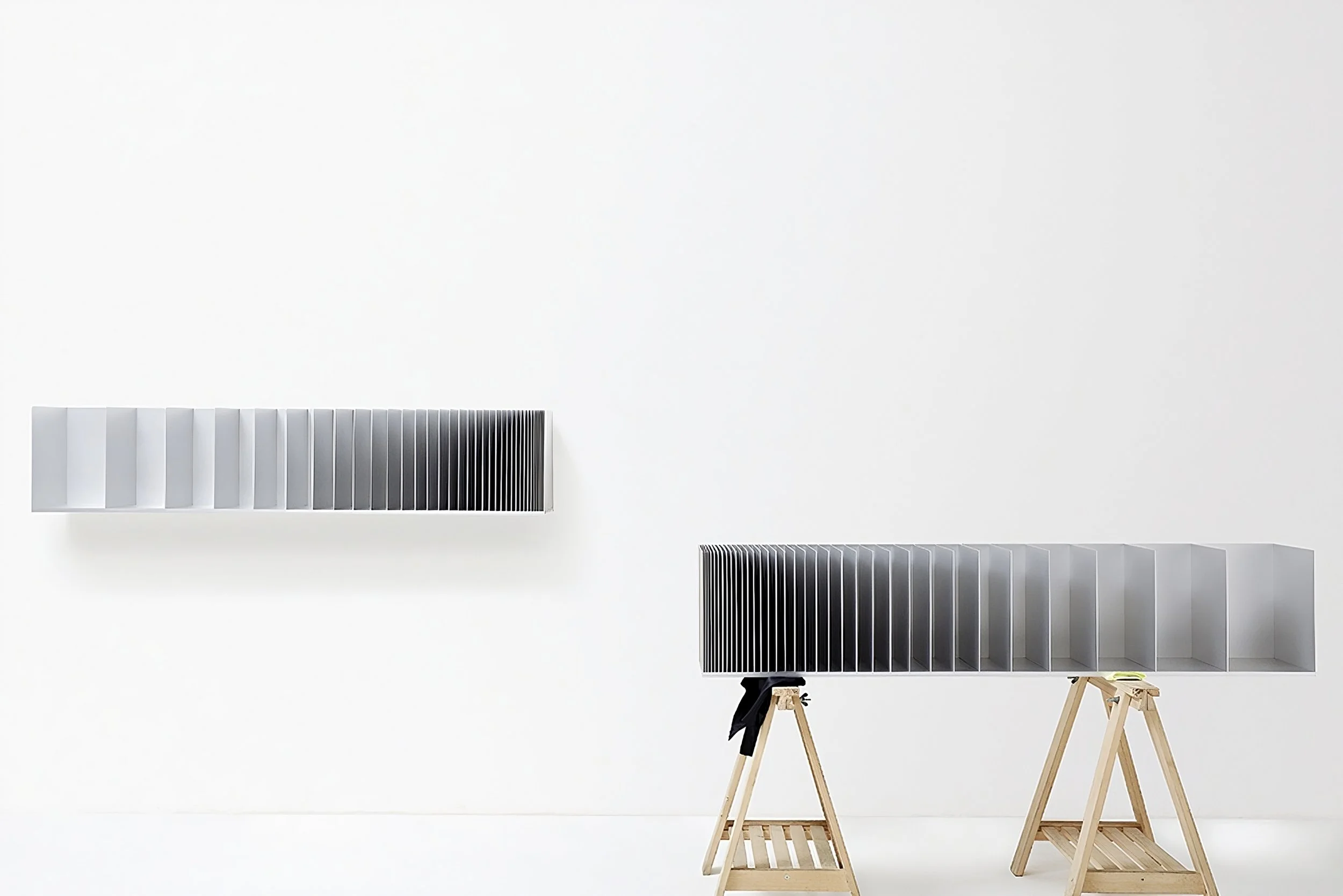 Rhythm Shelf grew out of the sense of disorder of an untidy bookshelf. Ironically, by sketching a series of vertical lines on a sheet of paper mirroring the disarray, an orderly rhythm started to emerge for Cocksedge.