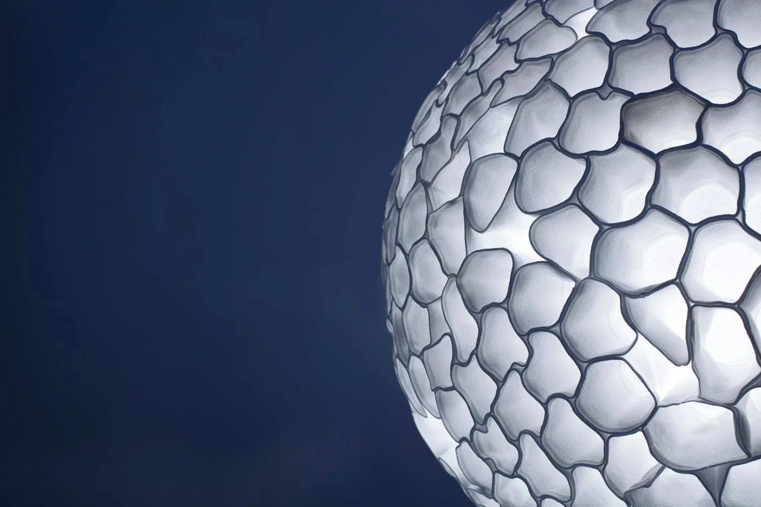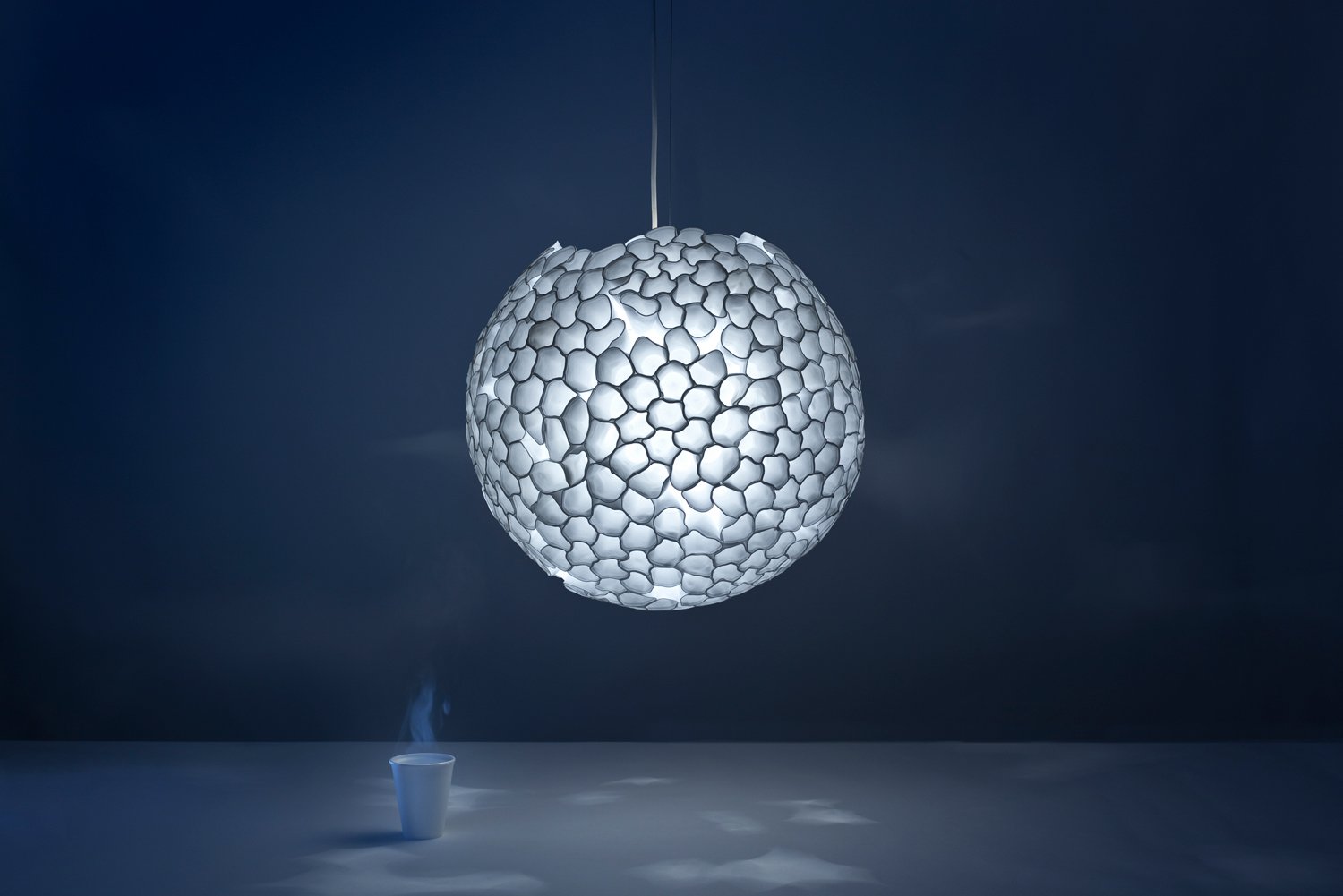 Read More +Styrene gathers these irregular forms in a new symmetry, broken only by small apertures that allow light to stream from within and create an intriguing shadow play on surrounding surfaces.